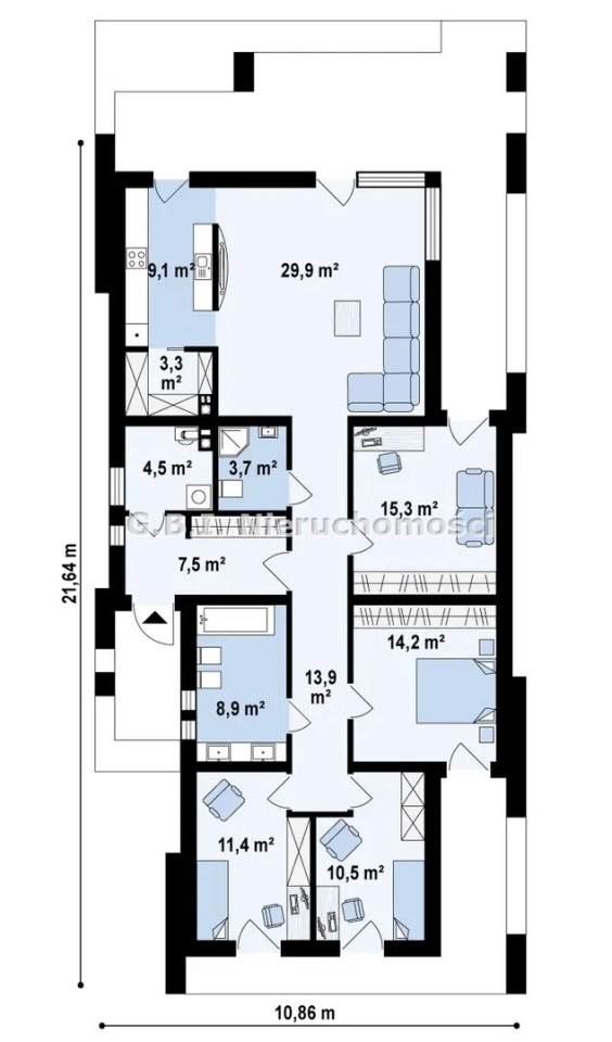 W części nocnej uwzględniono 4 sypialnie, łazienkę, wc, praktyczne pomieszczenie gospodarcze i potrzebną pralnię.